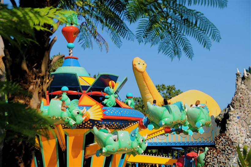 Следующая часть парка - Территория динозавров. Полёт на аттракционе TriceraTop Spin, для взрослых и детей, дорога по древней эпохе в эре динозавров, возможность окунуться в далёкое прошлое.