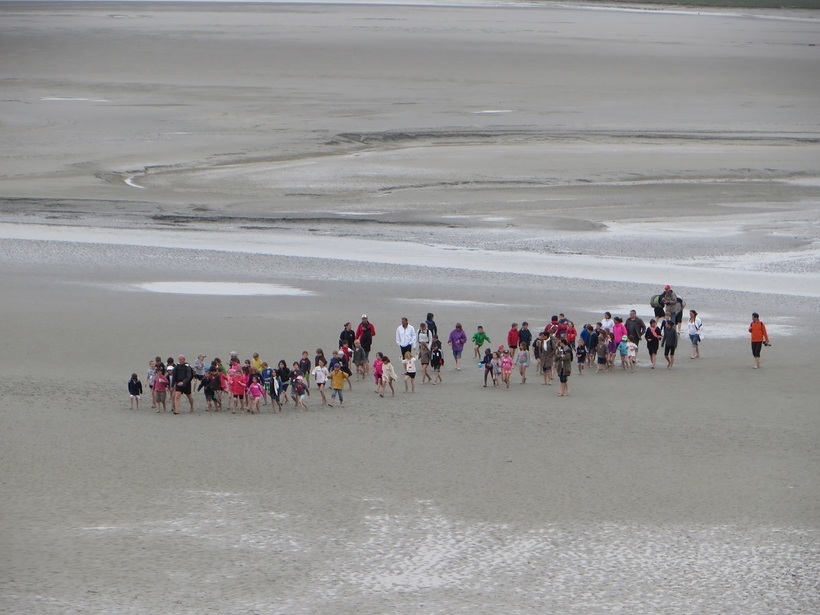 Поднимаясь на Аббатство Мон-Сен-Мишель, я неоднократно обращала внимание на такие группы, причем были среди них и маленькие школьники. Но всё это обязательно в сопровождении взрослых. Позже в интернете мы нашли такую контору. Они брали 9 EUR с взрослого и 5 EUR с ребенка. При этом были прописаны требования к дресс-коду и обуви, а также техника безопасности.