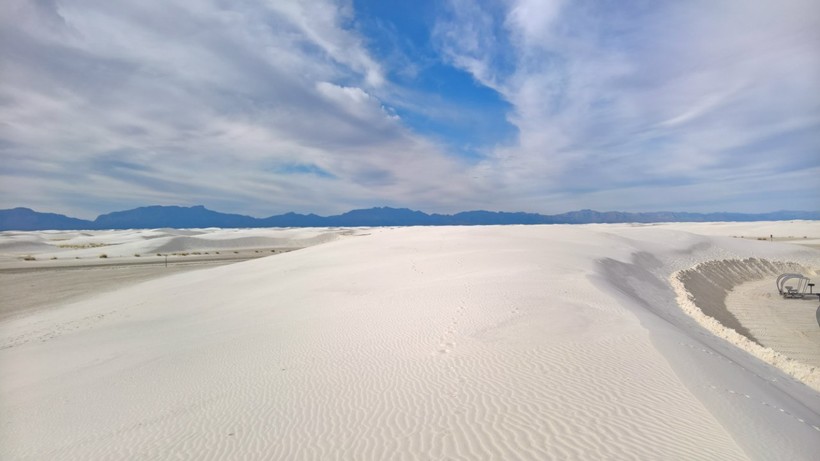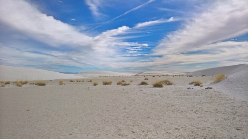 С самого утра мы направились в национальный парк. Въезд в парк на машине разрешен, за прямо символическую плату в $5 за машину и не важно, если ты смог вместить 10 человек в одну маленькую арендованную машинку. Красота этих мест поражает воображение - в начале пустыни еще можно встретить кое-какие растения, но по мере продвижения дальше остаются только барханы белоснежного песка и синева неба. Где-то вдали синеют горы, именно оттуда практически непрекращающийся ветер приносит очень хрупкую горную породу, которая перетирается на этом самом ветру в мелкую крошку. Красота!