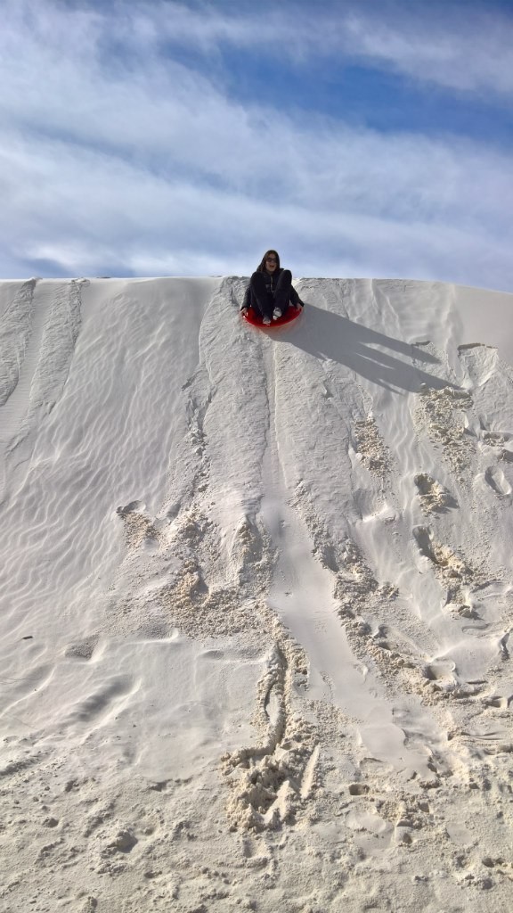 На входе в пустыню стоит маленький сувенирный магазин, и мы были несказанно рады, что зашли туда перед тем, как заехать в сердце национального парка. Первое что бросилось в глаза, были не магнитики, не открытки, и даже не сами горные породы, а... ледянки! Обычные такие ледянки, на которых мы, дети 90-х с удовольствием катались с горок зимой. Мы спросили у продавца, что это за прикол, а она нам рассказала, что с ними очень весело спускаться вниз по барханам! За $11 мы взяли одну ледянку на двоих и отправились за приключениями.