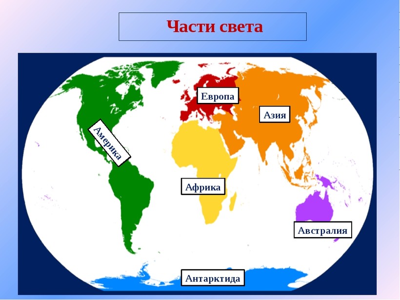 Надо запомнить, что части света — это не материки! Ведь на карте не найти материк Европа или Америка. Часть света Европа находится на материке Евразия, а такая часть света как Америка включает оба американских материка.