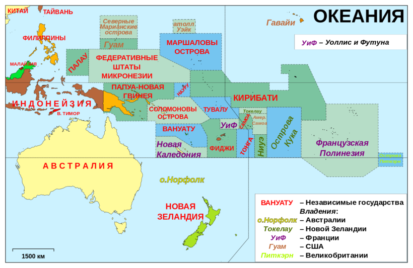 В состав Океании входят 14 самостоятельных государств и 11 зависимых территорий.