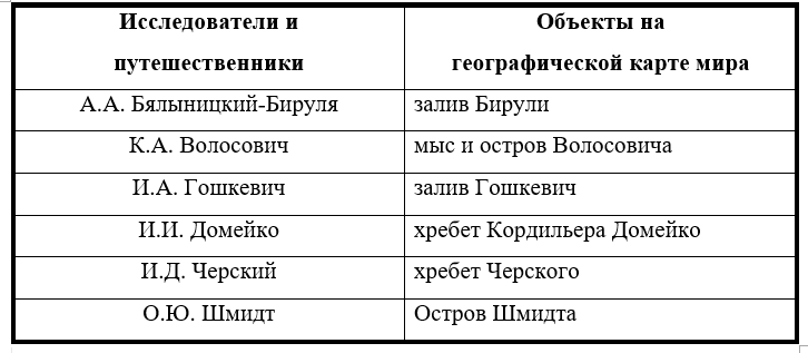 Используя дополнительные источники информации и географические карты, заполните таблицу. Имена белорусских исследователей и путешественников на карте мира. Исследователи и путешественники: 1) А.А. Бялыницкий-Бируля 2) К.А. Волосович 3) И.А. Гошкевич 4) И.И. Домейко 5) И.Д. Черский 6) О.Ю. Шмидт Объекты на географической карте мира: