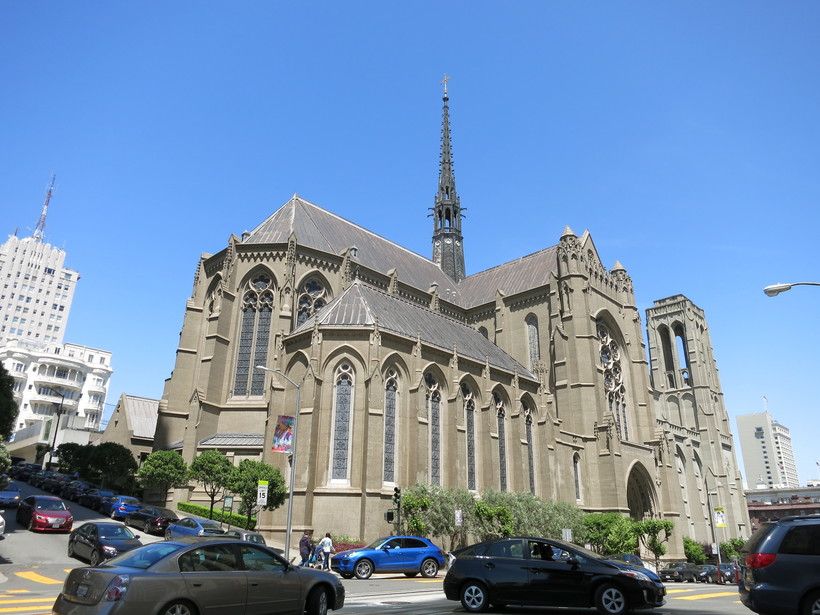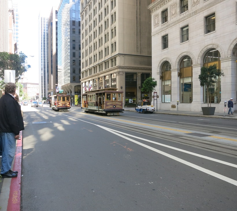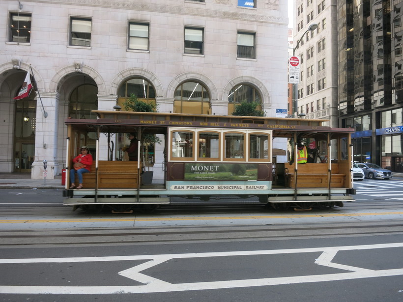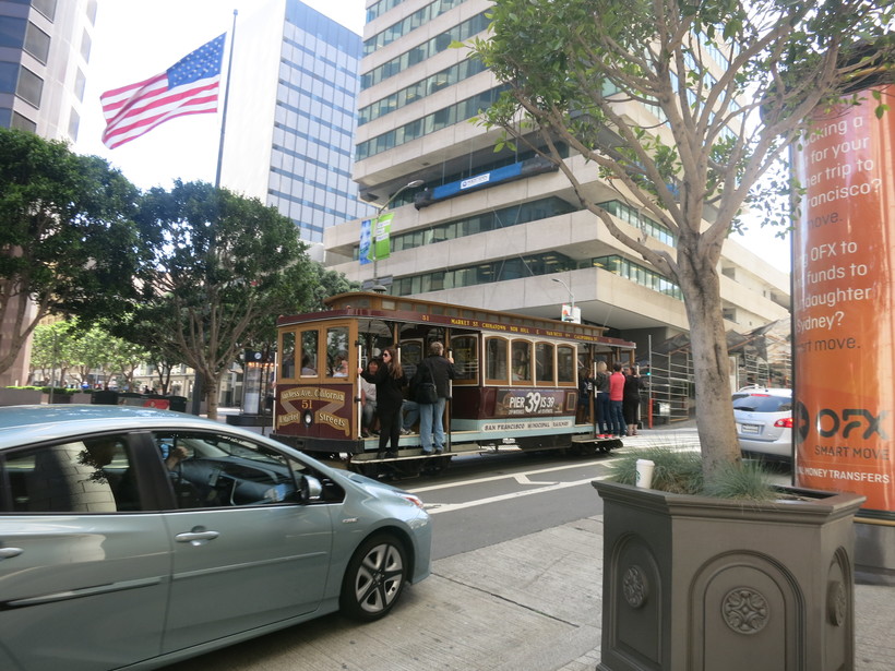 Трамвай движется по рельсам за счет канатов. Ведущий канат проложен под землей, за него цепляется крюк трамвая — и транспорт начинает движение. Дополнительное преимущество этой системы в том, что трамвай может ехать под углом как вверх, так и вниз по крутым холмам. Начинает свое движение трамвай у рыбацкой пристани, рядом с Пирсом-39, проезжая вверх по улице, мы увидели Чайнатаун , Кафедральный собор Грейс и даунтаун.
