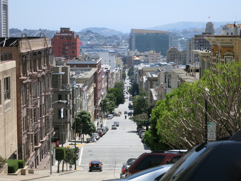 Это Сан-Франциско! И я точно знаю, какая песня сейчас у вас в голове! Но ассоциируется этот город в первую очередь, не с песней, а с крутыми холмами. Дома, стоящие под уклоном, машины, припаркованные под углом и постоянные спуски и подъемы. Преодолевать их пешком трудно, в этом на помощь туристам приходят канатные трамваи. Одна из самых знаменитых достопримечательностей Сан-Франциско.