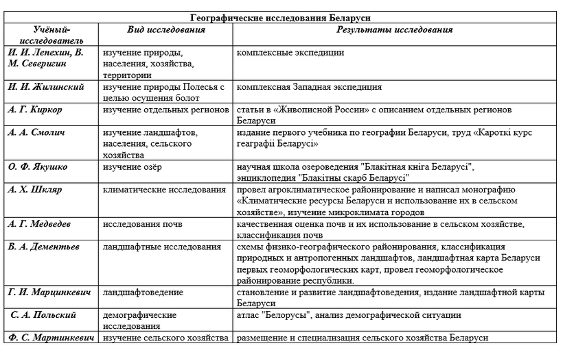Заполните таблицу Географические исследования Беларуси. Учёный-исследователь: 1) И. И. Лепехин, В. М. Северигин 2) И. И. Жилинский 3) А. Г. Киркор 4) А. А. Смолич 5) О. Ф. Якушко 6) А. X. Шкляр 7) А. Г. Медведев 8) В. А. Дементьев 9) Г. И. Марцинкевич 10) С. Польский 11) Ф. С. Мартинкевич Вид исследования: Результаты исследования:
