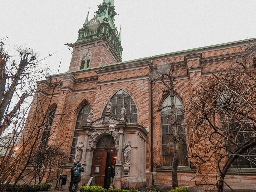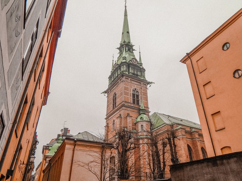 Если смотреть на Стокгольм сверху, то светло-зелёный шпиль Немецкой церкви видно сразу. Но, прогуливаясь по узеньким улочкам Гамла Стана (Старого города), можно пройти мимо, поскольку она как бы зажата между двумя домами. Наверно, если бы я захотела посмотреть на церковь повторно, то вряд ли бы нашла дорогу, но я вообще плохо ориентируюсь на месте.