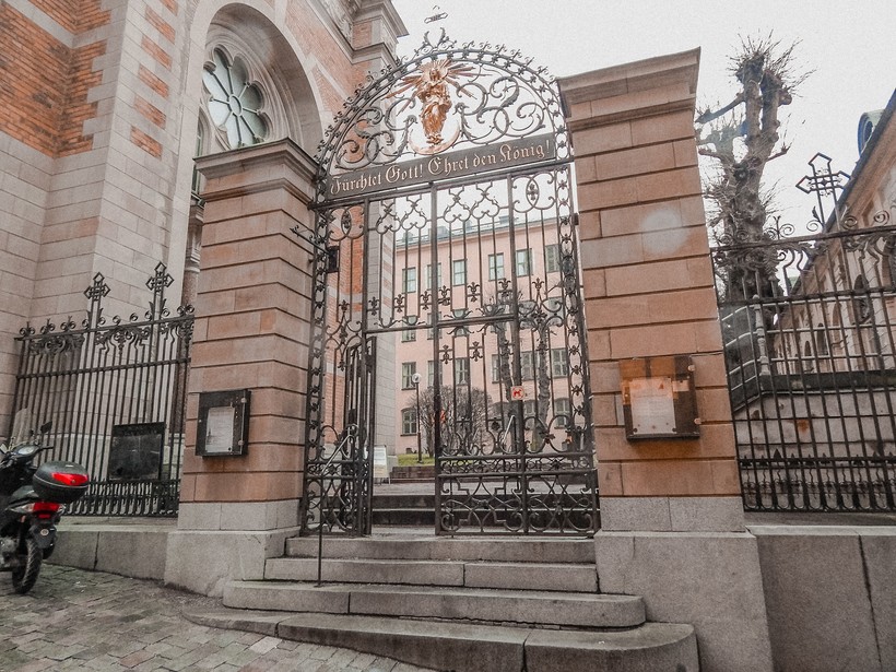 Подобраться к Немецкой церкви можно с двух сторон: с улиц Tyska Brinken и Svartmangatan. Я зашла через северные ворота с Tyska Brinken, надпись на которых гласит: «Fürchtet Gott! Ehret den König! — Бойтесь Бога! Чтите короля!»