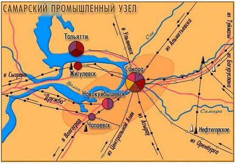 По отношению к этому городу, как к материнскому, существуют два города-спутника: Чапаевск и Новокуйбышевск. Первый поставляет в Самару необходимую для промышленности химическую продукцию, а второй — нефтепродукты. У другого крупного поволжского узла — города Тольятти, спутником является город Жигулевск, который обеспечивает его металлопрокатной продукцией. К другим городам-спутникам на Поволжье можно отнести:
