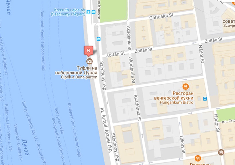 Добираемся до остановки Kossuth Lajos tér M. Продвигаясь в сторону набережной, увидите на краю Дуная обувь разных размеров. Значит, место найдено.