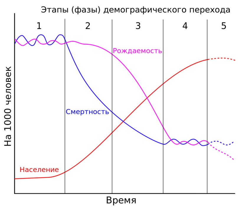 Демографический переход — это снижение рождаемости среди населения, и, как результат, смена процентного соотношения разных возрастных групп (пример - высокоразвитые страны, где численность пенсионеров превышает количество детей). Так же при демографическом переходе часто снижается и уровень смертности, повышается продолжительность жизни. Практика показывает, что этот процесс является естественным при переходе к индустриальному обществу.