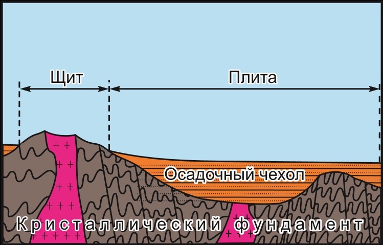 Прикрытые чехлом части платформы называют плитами, иногда — просто платформами, а участки с оголенным фундаментом — щитами.