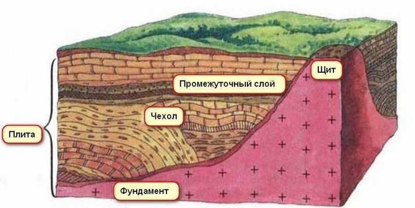Что касается строения, то у каждой платформы есть фундамент, который обычно прикрыт слоем осадочных пород. Такой слой называется чехлом.