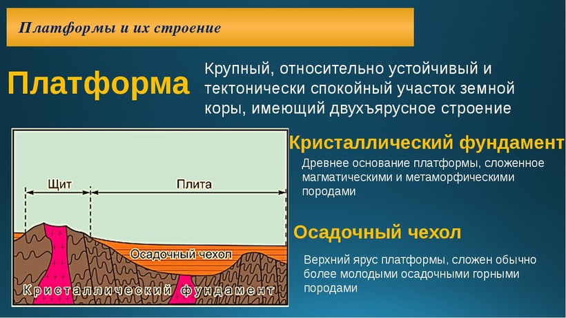 Платформа — это крупный, самый устойчивый и сейсмически спокойный участок литосферной плиты, да и вообще всей литосферы. Их можно разделить на древние (докембрийского периода) и более молодые (палеозойского периода) платформы. Платформа делится на два яруса — фундамент (состоит из кристаллизованных пород) и чехла (состоит из осадочных пород).