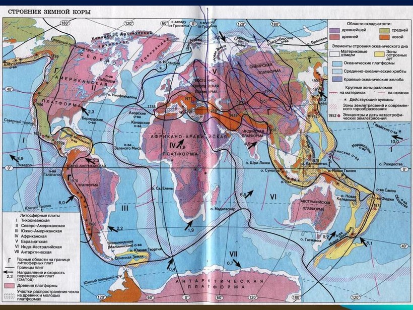 Литосфера состоит из отдельных блоков, перемещение которых создает и меняет очертания материков и океанов. Платформа является частью литосферы. Платформа — это массивная, вполне устойчивая составляющая земной коры, которая отличается низким уровнем сейсмичности. Состоит из двух «слоёв». Впервые о возможном движении материков высказал предположение ученый Альфред Вегенер. На границах между литосферными плитами происходят разнообразные процессы, имеющие серьёзные последствия для нашей планеты. Характер этих процессов зависит от того, как движутся литосферные плиты, они могут: