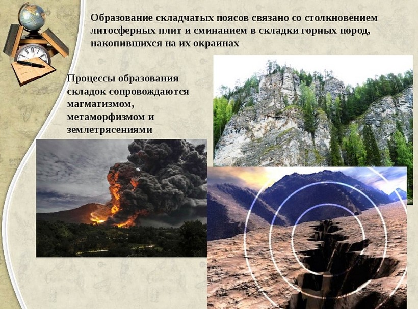 Проще говоря, литосферные плиты двигаются, сминают одна другую, творчески формируя рельеф, магма всячески вступает в контакт с горными породами, вот поверхность из ровной превращается в складчатую.