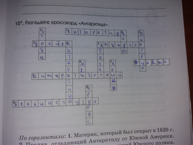 Разгадайте кроссворд «Антарктида». По горизонтали: 1. Какой материк был открыт в 1820 году? 2. Пролив, отделяющий Антарктиду от Южной Америки. 3. Исследователь Антарктиды, достигший южного полюса. 4. Второй по величине кит. 5. Крупный полуостров материка. 6. Русский мореплаватель, открывший материк . По вертикали: 1. Одна из самых крупных равнин Антарктиды. 2. Молодые горные цепи — Антарктические . 3. Так по-гречески называлось созвездие Большой медведицы. 4. В переводе название этой птицы «крыло-шпилька». 5. Южная полярная область Земли. 6. Представители флоры. 7. Морские рачки. 8. Вулкан.