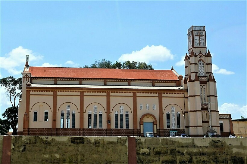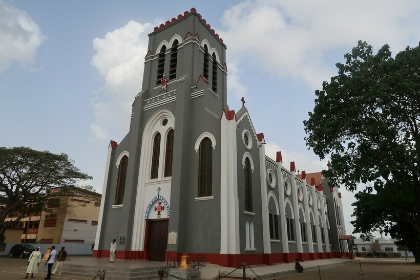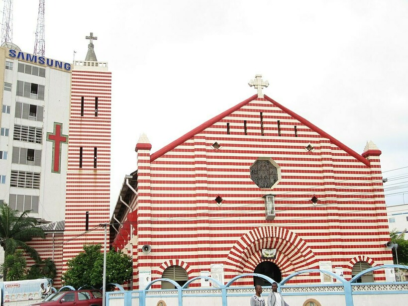 кафедральный собор Котону или Нотр-Дам-де-Мисерикорде (Милосердной Божьей Матери) — снаружи здание покрыто бело-красной керамической плиткой, внутри находятся бежево-коричневые арки над лавками, рядом расположена небольшая башенка;