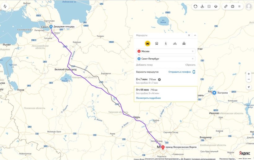 Москва - Санкт-Петербург - расстояние, время, стоимость бензина