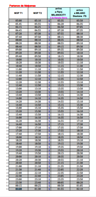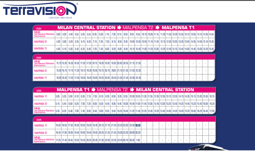 - Malpensa shattle отправляется от остановок, расположенных между выходами № 3 и № 4 (терминал 1) и напротив выхода из терминала 2.