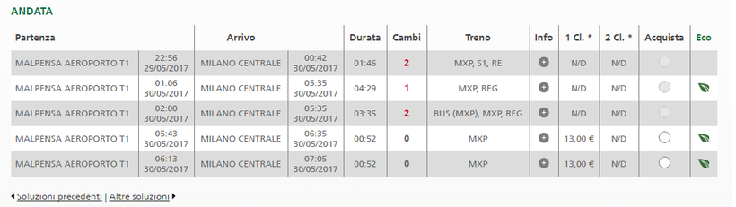 Поезда из аэропорта Мальпенса в Милан ходят практически без перерыва, правда в ночное время возможны длительные интервалы. Например, такое расписание: