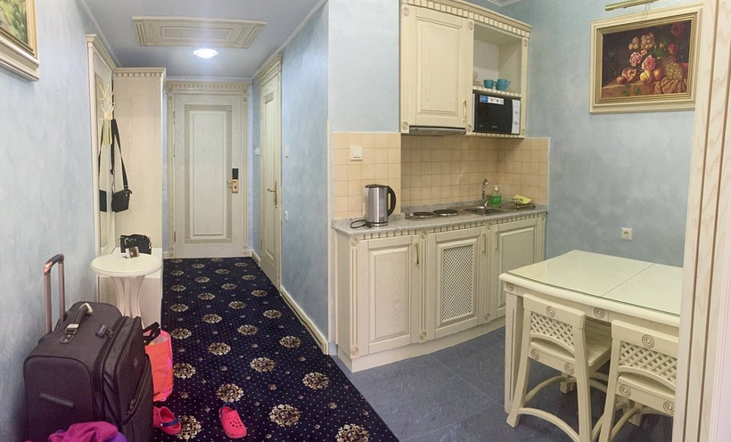 Очень здорово, что в номерах есть мини-кухня с необходимой посудой, холодильник, чайник, микроволновка