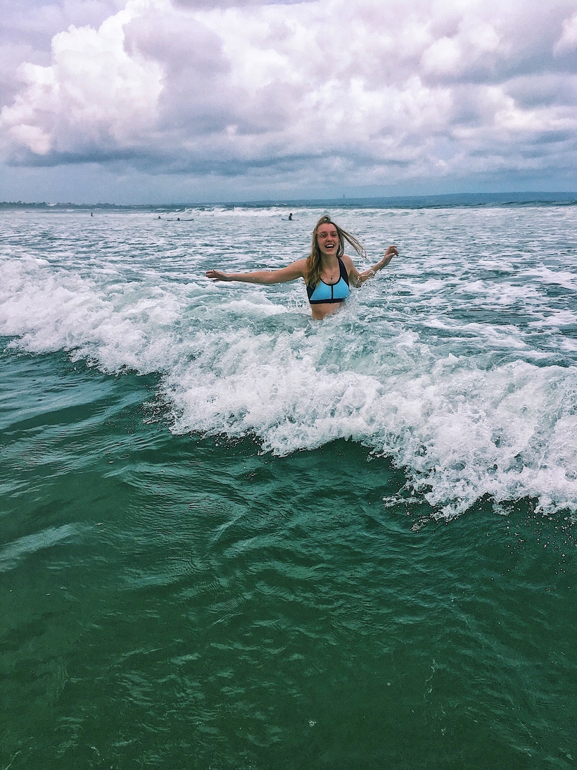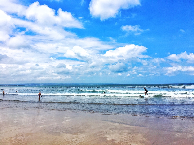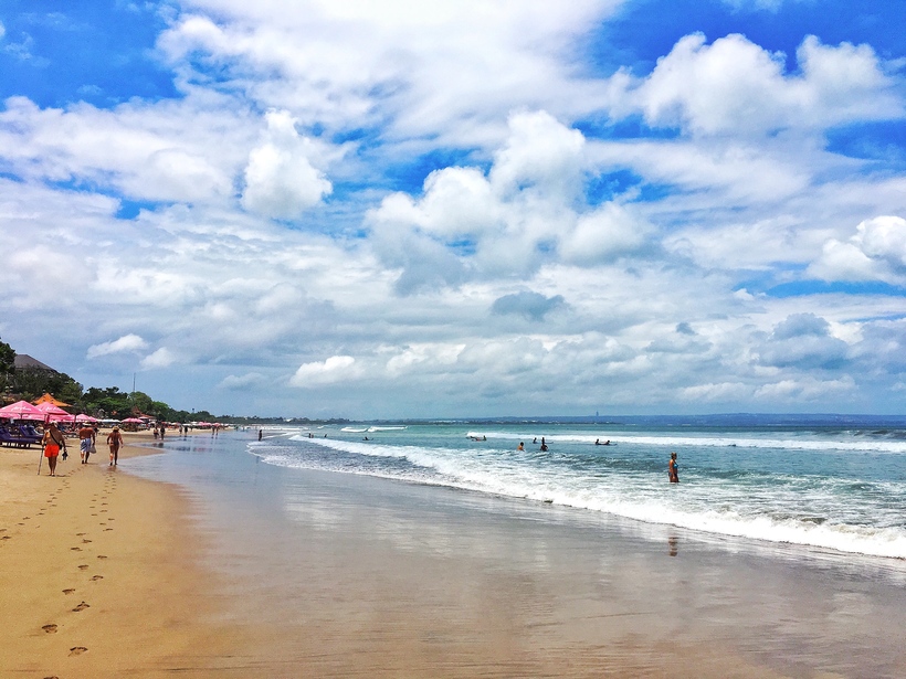 Пляжные развлечения и кафешки, музыка, золотой песок, молодые накаченные мужчины, тренирующие начинающих сёрферов на суше и в воде и сильные волны. Здесь не получится просто поплавать. Но учитывая то, что спокойно поплавать на Бали практически нигде не получится, думаю что не плавать вы сюда приехали. Если бы я приехала на остров с ребёнком, этот пляж выбирать бы не стала. Хотя он очень широкий, удобный и оборудованный всем необходимым, придётся все время следить, чтобы ребёнка не унесло волной или не сбил начинающий серфер.