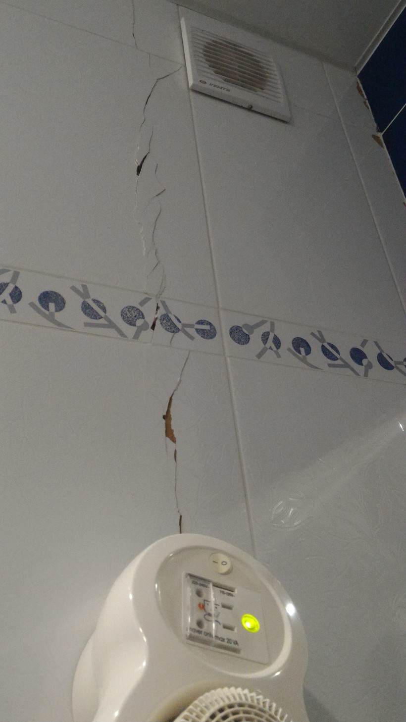 трещина по всей стене в санузле (удивительным образом захватывающая немного фена),