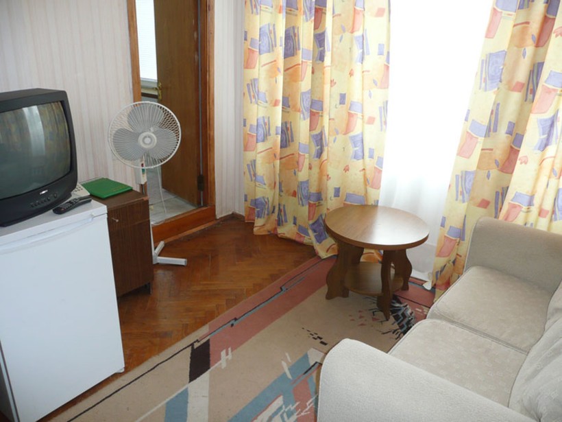 Отдыхать в санатории хорошо, но вот жить в тесных комнатушечках не очень. Я взяла полулюкс, но условия в нем не лучше, чем в обычном номере. Одна комнатка подразумевала кровать, причем жесткую, а вторая диван, стол без стула и холодильник. Мебель старая, запах от нее соответствующий.