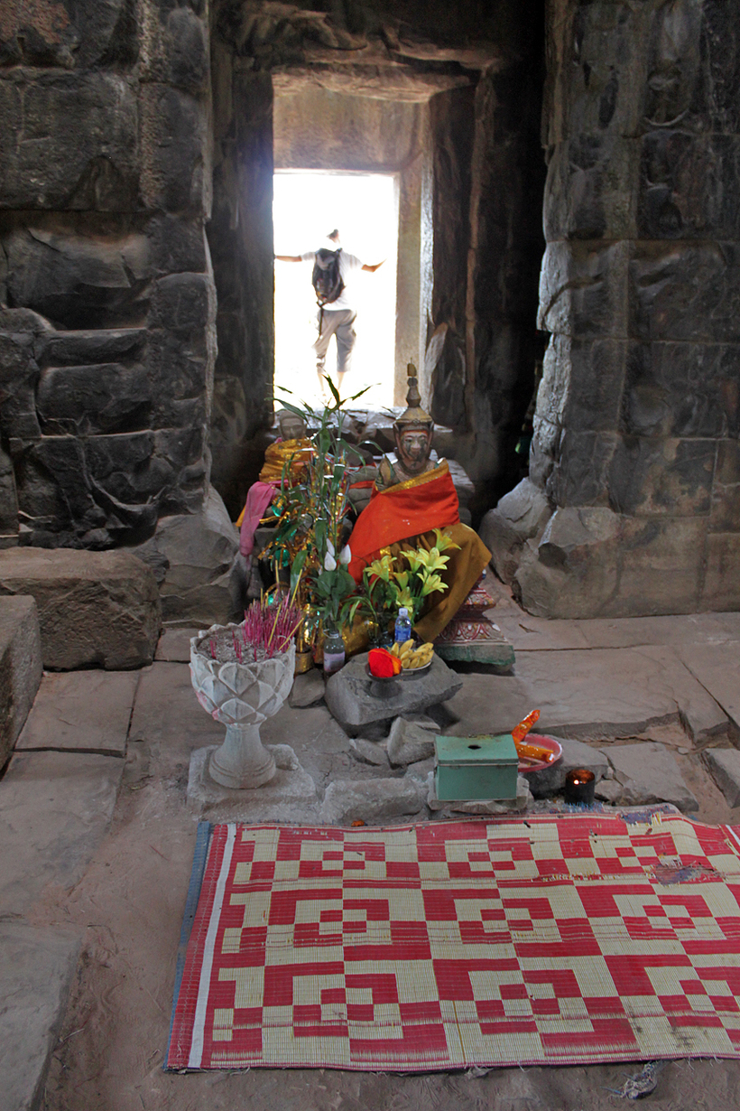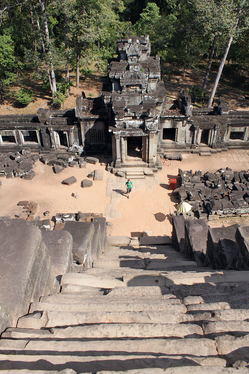 Лично меня также порадовало небольшое количество людей по сравнению с другими храмами. Хотя он находится на видном месте, прямо у дороги, примерно на полпути от Та Прома к Victory Gate Анкгор Тома. Но посетителей здесь меньше, это факт. Наверх поднимаются, вообще, единицы. Но их можно понять – по жаре карабкаться по узким и высоким ступеням удовольствие весьма сомнительное.