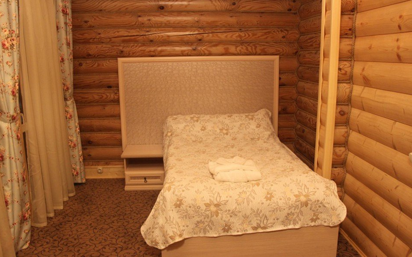Мне попался номер в домике возле бассейна, внутри очень уютно. Стены из отесанного дерева, все так по-русски, натурально. В номере был просто непередаваемый аромат древесины. Кровать не очень удобная, слишком жесткий матрас. Слышимость просто отличная, в самом плохом смысле этого слова, любой шум как-будто в номере.