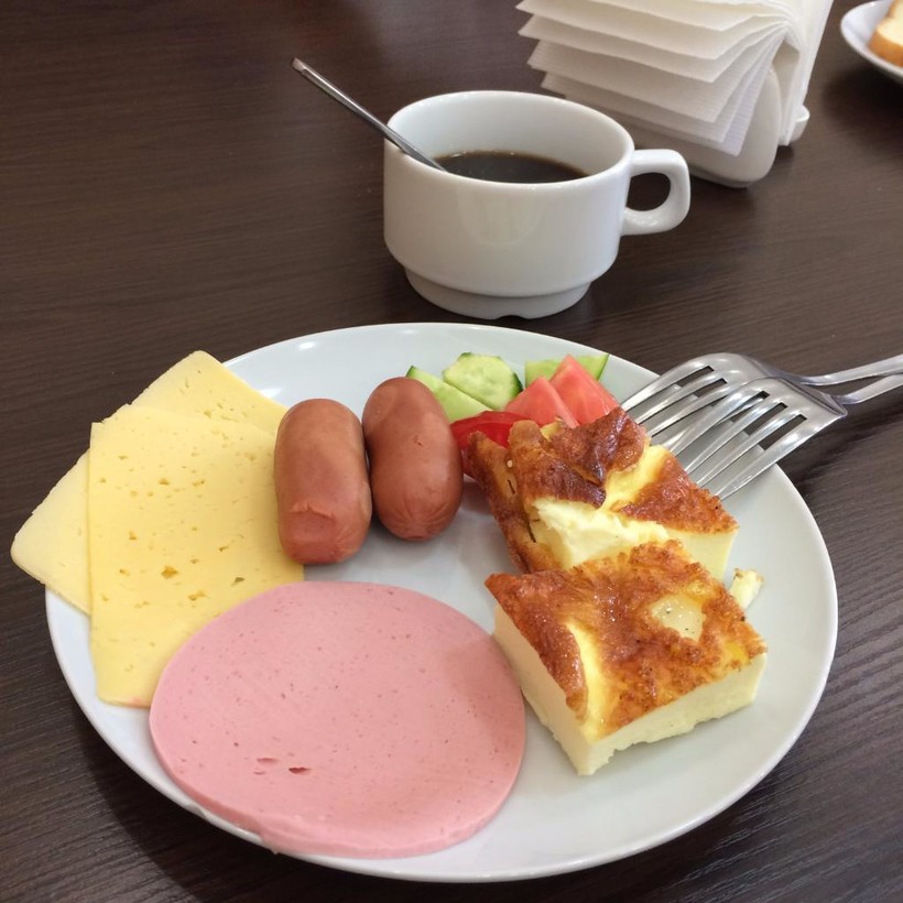Завтраки крайне однообразны,макароны,гречка,рис, сосиски,омлет,вареные яйца,помидоры,огурцы и колбаса с сыром и каша