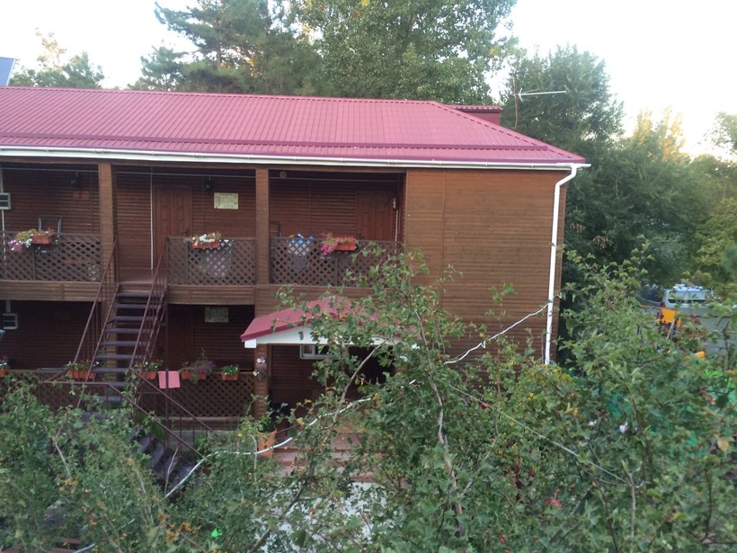 На фото только деревянный корпус, есть еще один каменный с узкой металлической винтовой лестницей, узким двориком в торец соседнего отеля и еще какие-то непонятные домики-вагончики