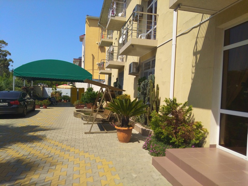 Сама территория очень ухоженная, много растении, качеля, диваны, пальмы