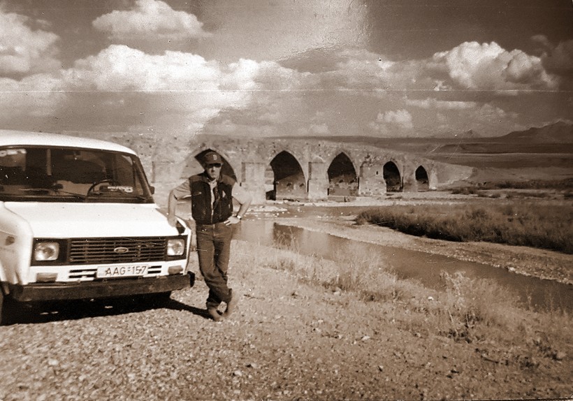 Древний арочный мост Чобан Деде (по-английски называется Kobandede Bridge) на историческом «Шелковом пути» стоит на реке Арас в Турции. Построен в 1298 году эмиром Джоан Ноин. Форма моста отражает архитектурный стиль сельджуков и Ильханлы. Мост имеет длину 128 метров и ширину 8,5 метра. Самый большой арочный пролет моста - 13 метров, а самая высокая точка - 30 метров. До сих пор функционирует. Это фото было снято 1990 году