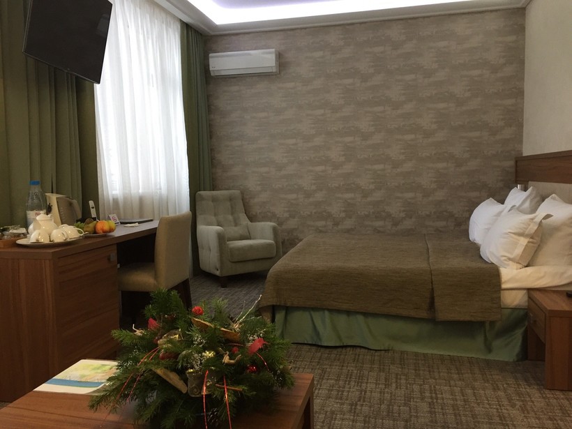 Номер у меня был обычный стандарт с видом на лес, но им я осталась довольна. В комнате: