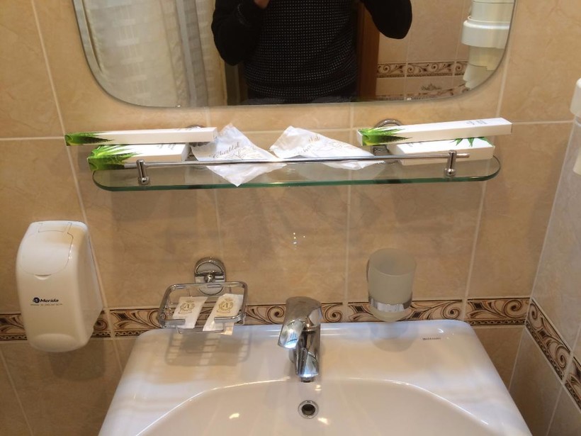 В ванной чисто, туалет продезинфицирован, о чем сообщает специальная ленточка на крышке. Приятно порадовало наличие полного комплекта мини-косметики, халата, тапочек, полотенец (по 3 штуки на каждого постояльца) и фена: