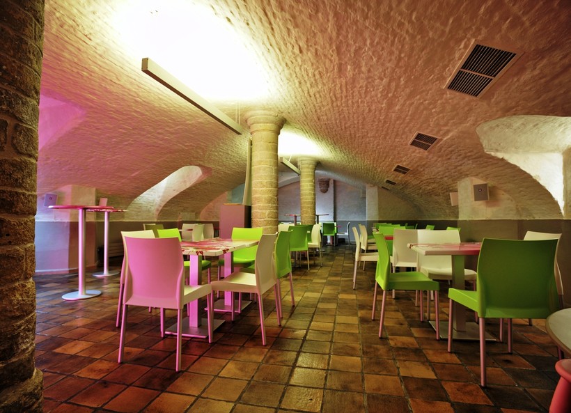 Здесь же в подвальчике есть кафе, где вы сможете попробовать тот самый, нежный и хрустящий, знаменитый бельгийский картофель фри. Подают его, кстати, традиционно, в бумажных вощеных пакетах с разнообразными соусами. Здесь также можно заказать и другие блюда.