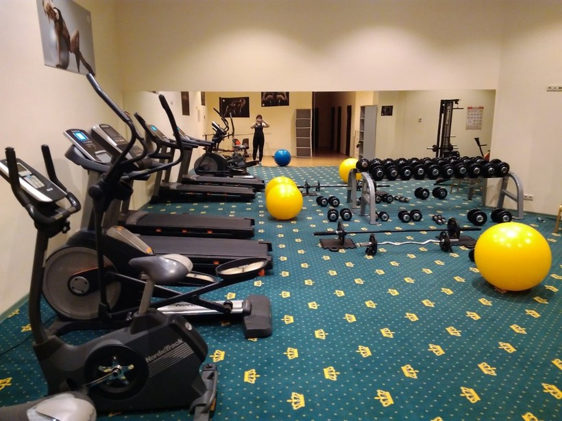 Тренажерный зал весьма скромный: беговых дорожек две, но работает только одна, к тому же бьется током