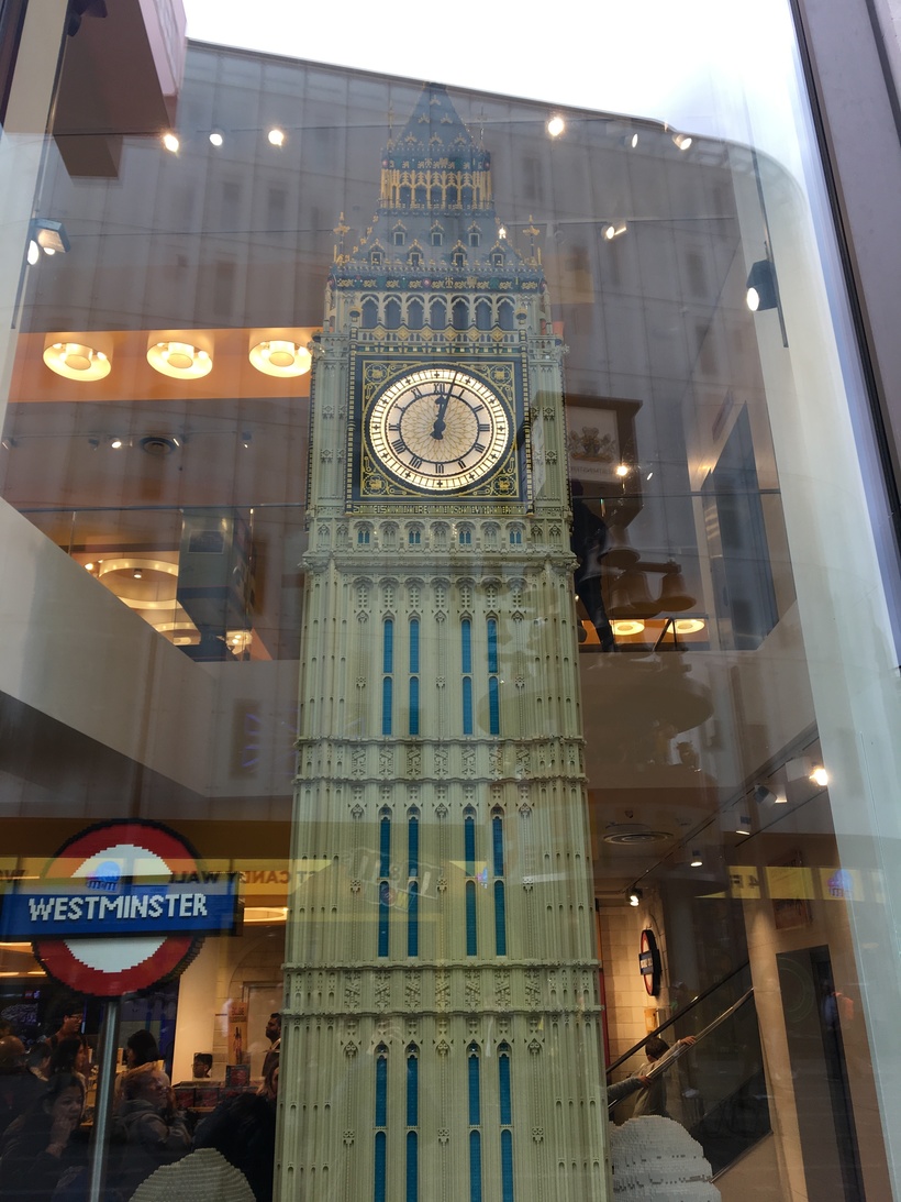 Может быть потому, что они расположены в старинных домах и архитектура старинных особняков, настраивает и на интересные покупки внутри магазинов. Так я не удержалась и купила красивые коробки английского чая в магазине на площади. Соседний магазин конструкторов Лего я посетила, потому, что мне всегда были интересны выставленные огромные скульптуры из малюсеньких деталей Лего. В витрине магазина была расположена огромная башня с часами, я предполагаю, что это знаменитый Биг-Бен.