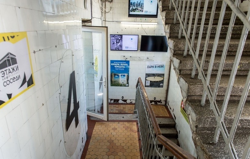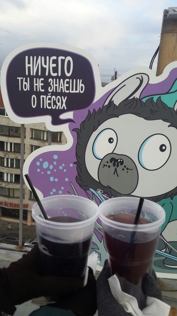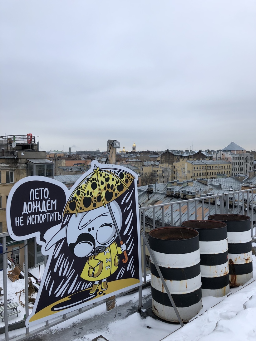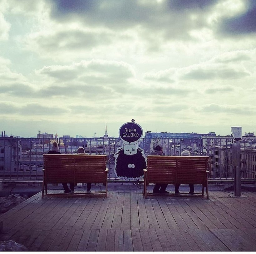Сразу попадаешь, как будто, немного в другое измерение. Главным связующим тут является лестничный пролет на пять этажей, по которому все все спешат, то вверх, то вниз, пытаясь попасть в свое пространство. Возможно в силу, того, что лестница не очень широкая, ощущения, что людей всегда очень много. Мы сразу рванули на крышу. Это на самом верху. Там купили билет за 100 рублей, ставят еще печать на руку( она смывается), для чтобы можно было весь день там погулять. Если вдруг замерз или пошел перекусить, можно потом спокойно вернуться. И вот мы на крыше. Я то не первый раз, поэтому уже более спокойна на эмоции. А вот подруга подзависла от восторга. В прошлый раз там была выставка из мимишных котиков, в этот из собачек. Так что фото будет много.