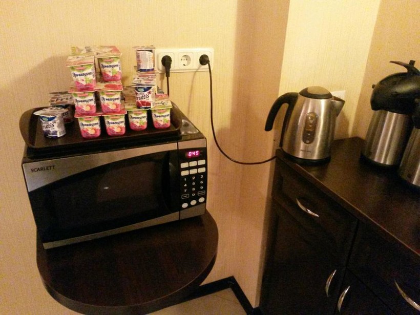 Отель расположен на разных этажах - за кипятком или погреть еду всем на кухню, не очень удобно