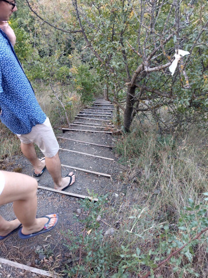 Спуск к морю,крутоват для людей пожилых с больными ногами,но можно приспособиться,нужны перила