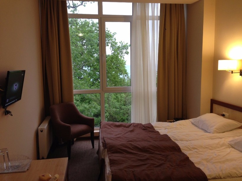 Но именно благодаря такому расположению из номеров отеля видно море и не слышно шум от проезжей дороги (Курортного проспекта