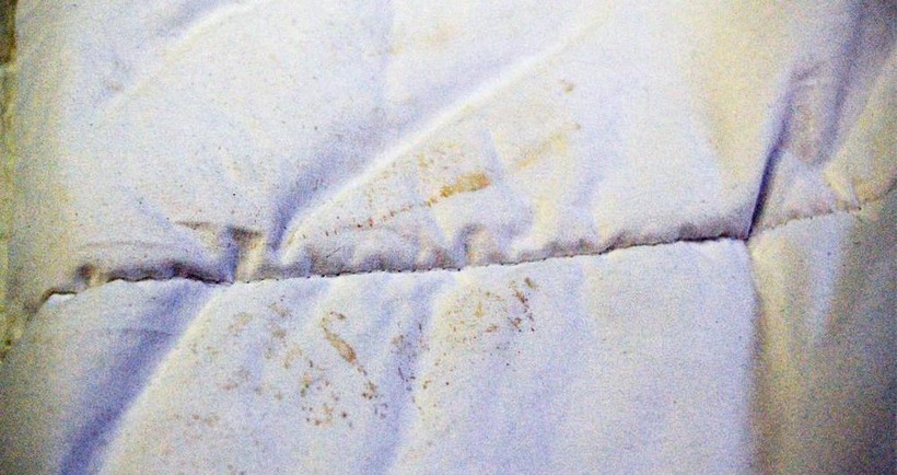 - постельное было грязное, пододеяльник был с пятнами, я решила его снять, но меня ожидал сюрприз похлеще — одеяло вообще было заляпано;