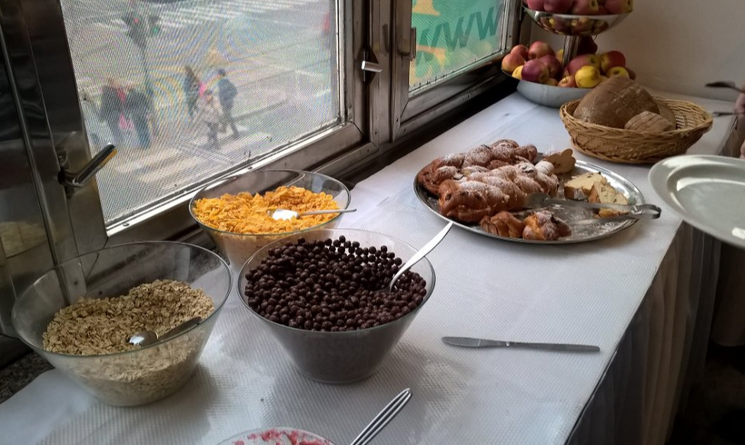 Скудный завтрак: по одной нарезке сыра и колбасы, отварные яйца, сосиски, один вид йогурта, два вида джема, хлопья с молоком, овощной салат (помидоры, капуста, перец), хлеб (можно подогреть), кексы