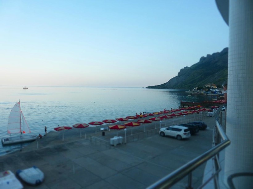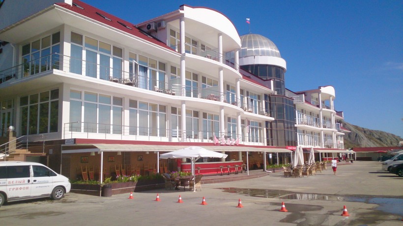 В Коктебеле выбор пал на этот отель из-за его расположения прямо у моря. Строение новое, с большими окнами, балконами и террасами.