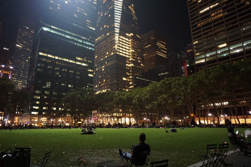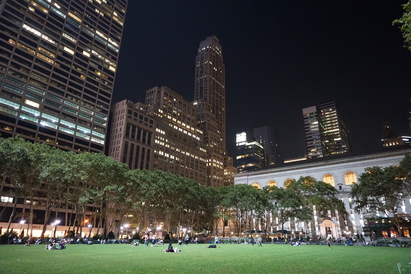 Не знаю вызовет ли этот парк у всех такие же ощущение, но у меня это любимое место в Нью-Йорке. По периметру парка деревья, всякие красивые кусты и цветы. В центре – огромная лужайка. С одной стороны парка – историческое здание Нью-Йоркской библиотеки, а с другой – современные небоскребы.Лужайки в штатах это не “по газонам не ходить”, они для людей. Поэтому что я советую: