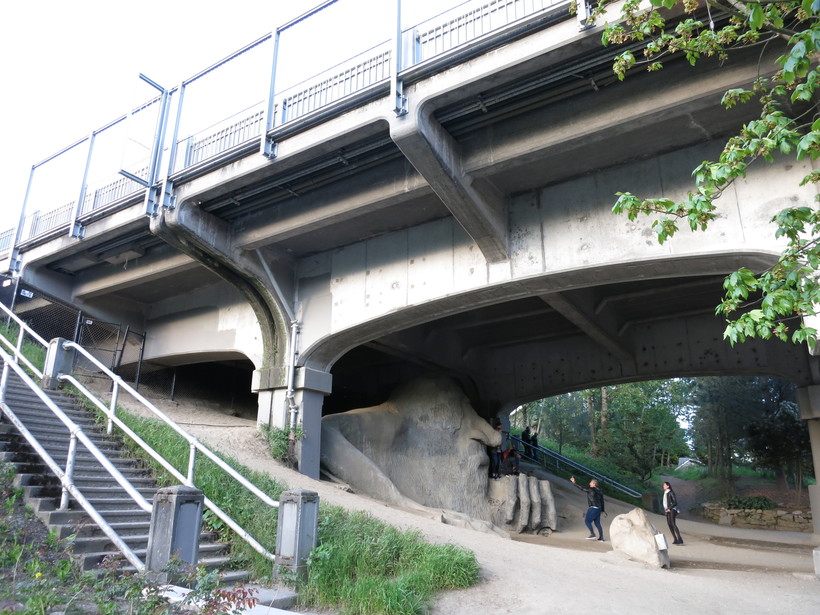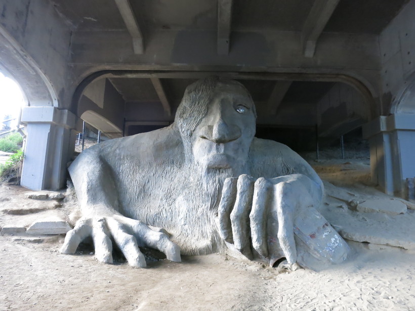 Тролль представляет собой песчаную скульптуру, вылепленную прямо у подножия моста. Вместо одного глаза у него автомобильная фара, а под левой рукой, видимо тот самый автомобиль. Кто вылепил этого тролля и с какой целью, мы не узнали. Но то, что это стало одним из самых посещаемых мест во Фремонте – это факт. Тролль не выглядит пугающим, а скорее наоборот более веселым и забавляющим.