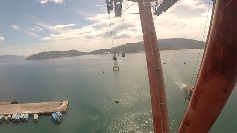 Канатная дорога. Во-первых, мне нужно было на ходу успеть зайти в кабинку. Да, скорость почти не заметная, но всё же страшновато не успеть в неё запрыгнуть. Во-вторых, вагончик стеклянный и из его окон можно наблюдать открывающийся вид на море, горы, город на все четыре стороны. Вагончики передвигаются по тонюсенькой верёвочке, привязанной к многочисленным опорам в виде Эйфеливых башень, закреплённых в море. Самая длинная канатная дорога в мире впечатляет и днём, когда с высоты птичьего полёта можно рассматривать окружающие виды, и вечером, когда опоры подсвечиваются неоновым светом. Дорога до острова Винпёрл заняла около пятнадцати минут.